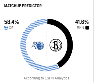 赛前,美媒ESPN预测本场比赛,魔术胜率58.4%,篮网胜率41.6%。